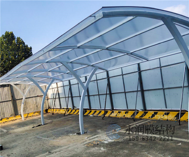 2.膜结构车棚顶部封板应选用茶色或宝蓝色阳光板封顶,与车棚全体骨架用压条铆接固定,耐酸碱腐蚀,有满足强度对棚内车辆起到维护作用。